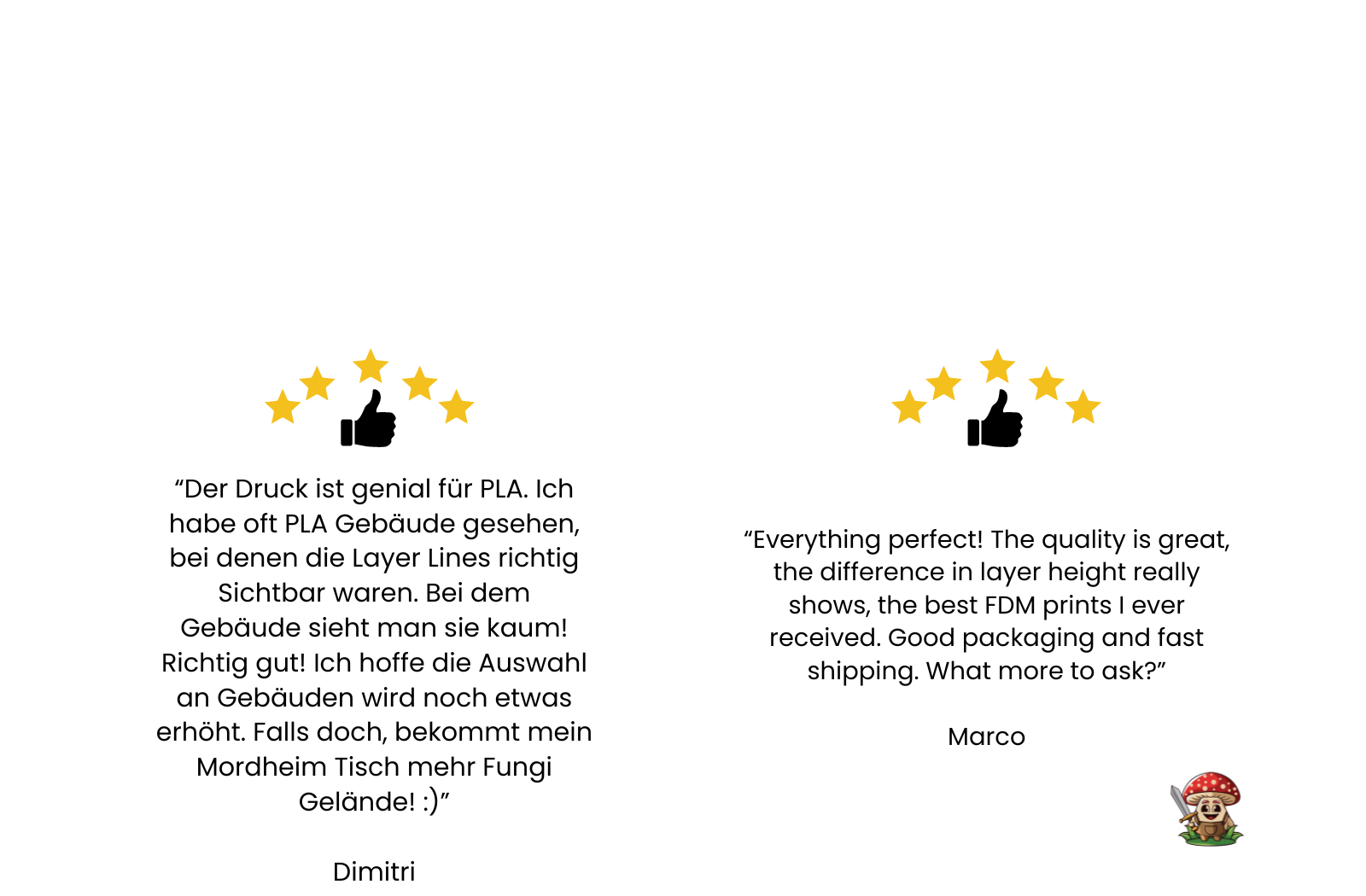 Bei uns findest du hochwertig 3D-gedrucktes Gelände und Zubehör für Miniaturenspiele, Skirmisher und Rollenspiele – detailreich, funktional und mit Sorgfalt entwickelt.